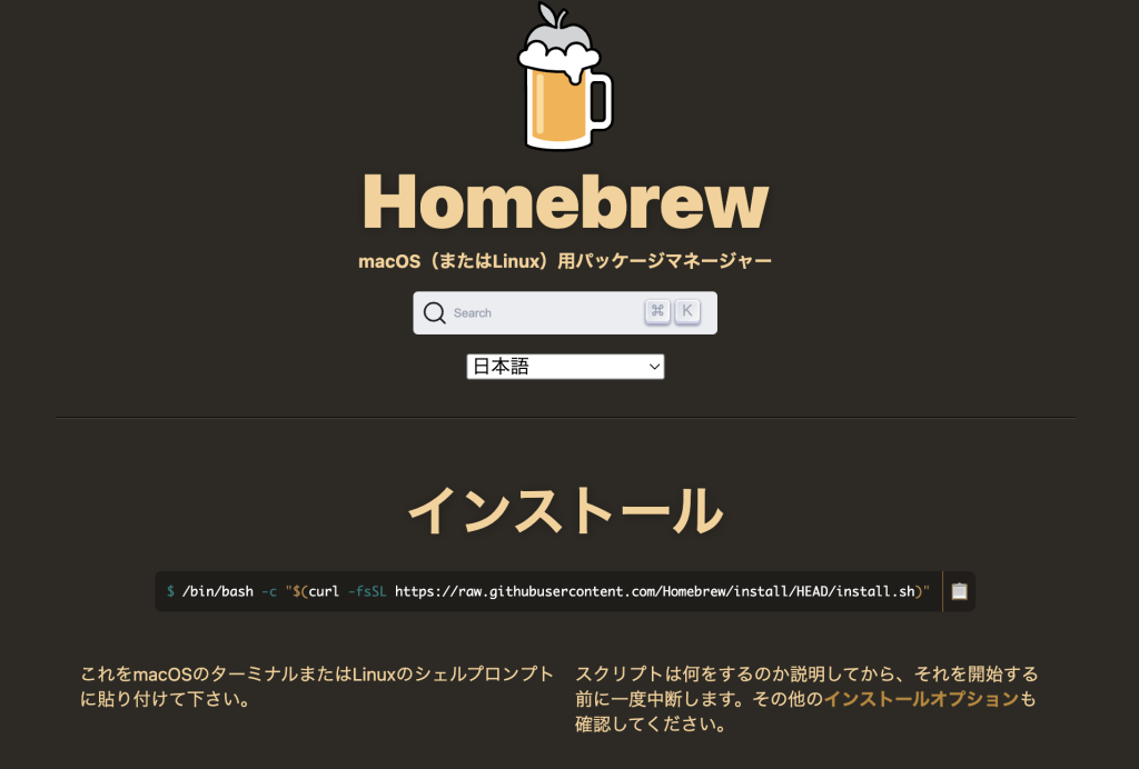 公式ページにアクセスして、「インストール」の下に記載されているテキストをコピーしてそのままターミナルに貼り付けて実行します。