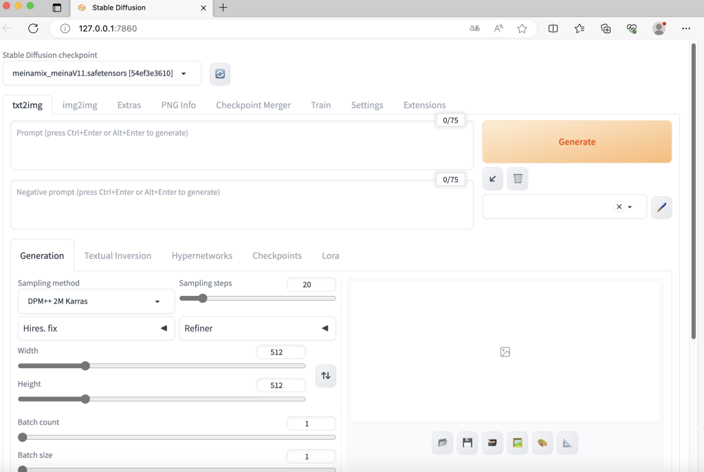 127.0.0.1:7860でのStable Diffusion Web UIのサイトが表示されれば、成功です。